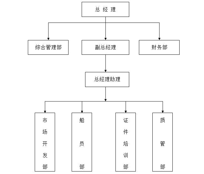 公司為了更好服務于船員和航運企業(yè)、相關合作單位等,廈門海盈海運特設立了總經(jīng)理直轄管理的副總經(jīng)理( 崗位)及綜合管理部、財務部等,同時設立總經(jīng)理——副總經(jīng)理——總經(jīng)理助理順序垂直管理的四個職能 部門:市場開發(fā)部、船員部、證件培訓部、質管部,為船員服務管理業(yè)務和其他業(yè)務提供有力的人力資 源和對口崗位保障。組織機構圖如下: